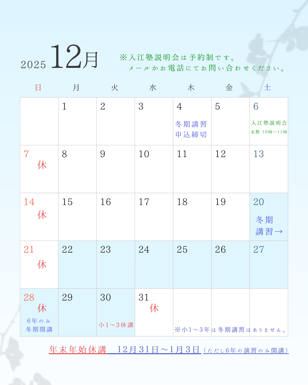 )入江塾説明会 対象:新小1~小5 入江塾・北野教室 10:00 ~ 11:00