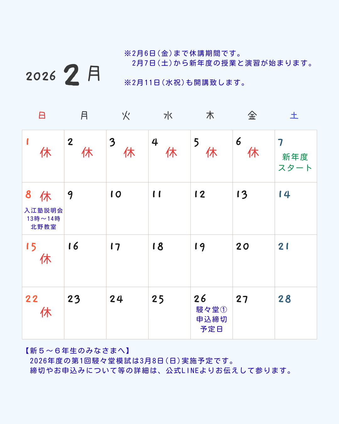 入江塾 説明会 対象:新小1~新小5 北野教室 13:00 ~ 14:00