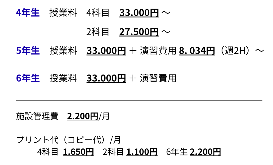 ①2科目受講の方は、4科との差額(春・冬期 2.750円 夏期 6.875円)が発生します。